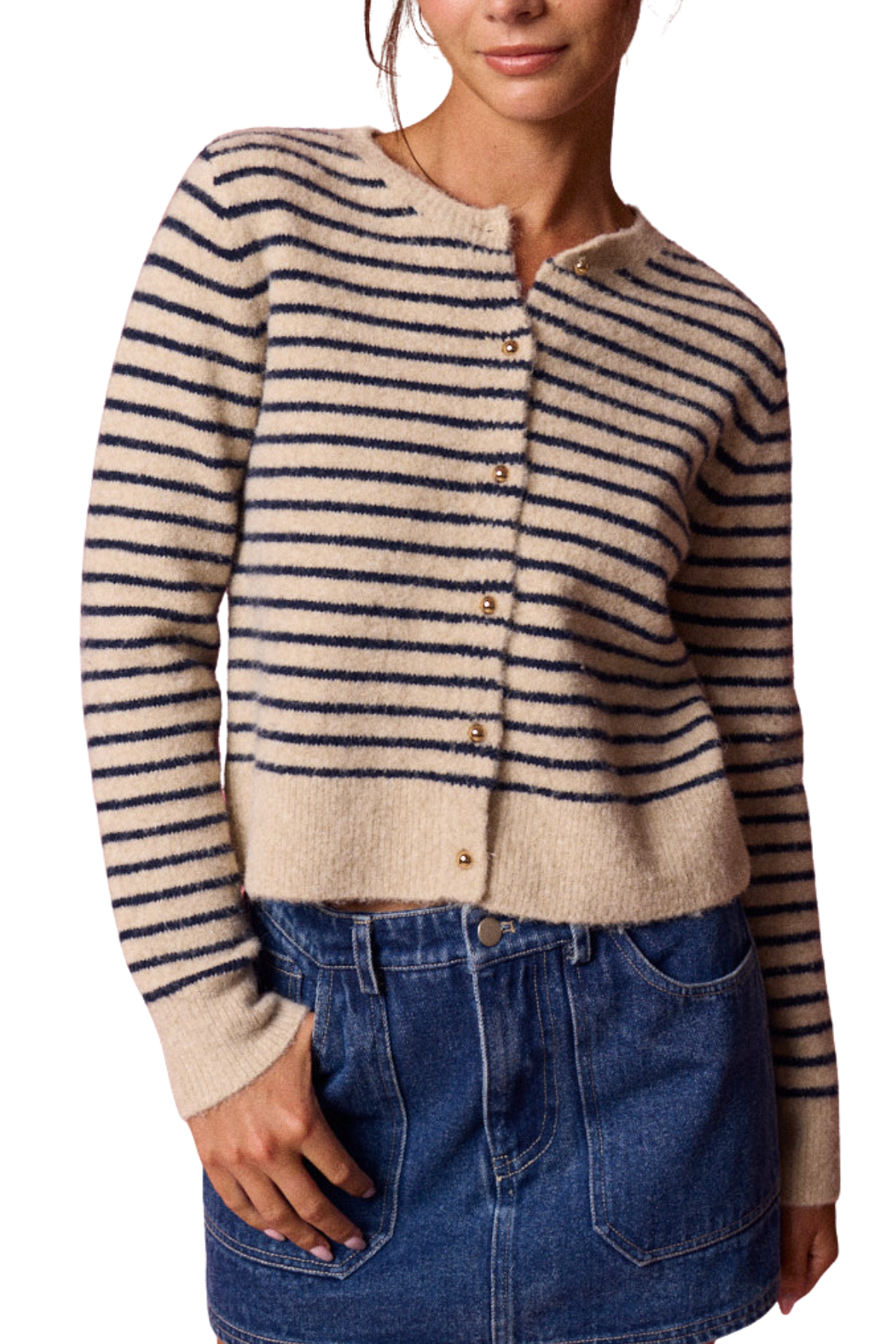 Layer up with the Becca Cropped Cardigan, where timeless style meets modern edge. This chic piece features taupe and black stripes that effortlessly complement any wardrobe, while gleaming gold detail buttons add a touch of sophistication. Cut to a flattering cropped length, it's the perfect finishing piece for dressing up basics or adding dimension to your favorite outfits. Versatile, polished, and undeniably fun!