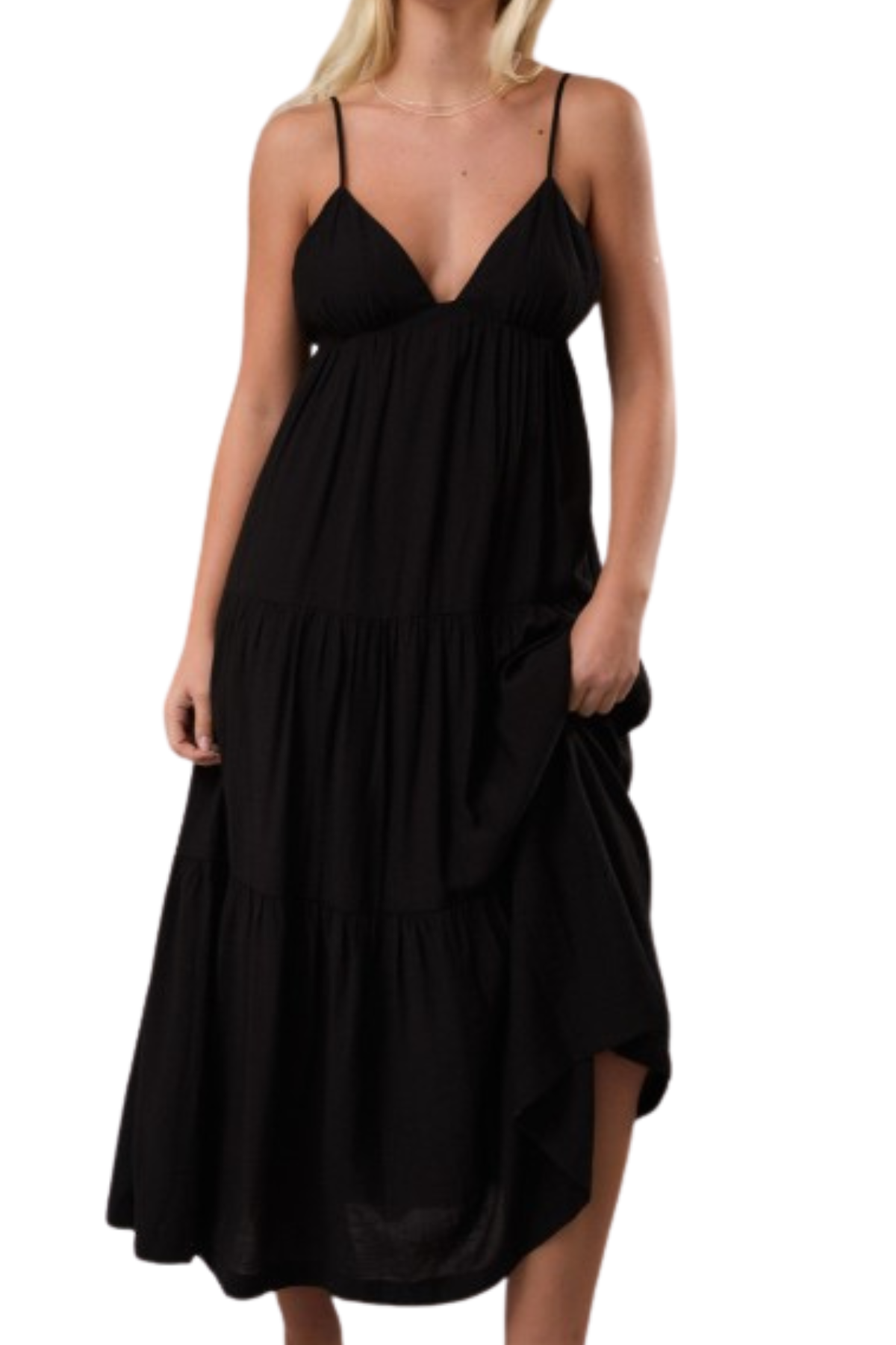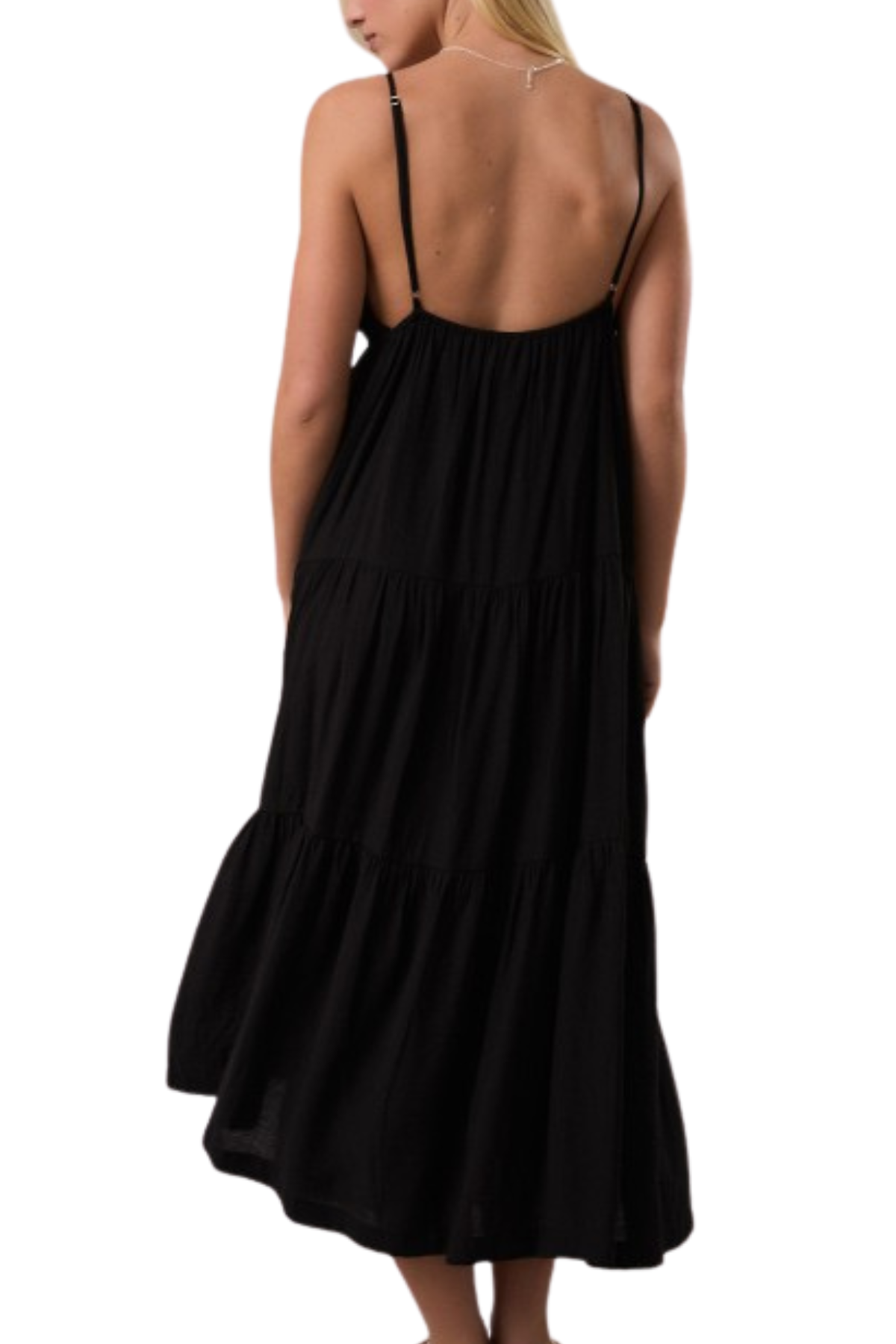 This gorgeous midi dress features v-neckline, low back, and tiered skirt. The perfect black dress you can dress up for date night or wear to hit the market on a summer day!