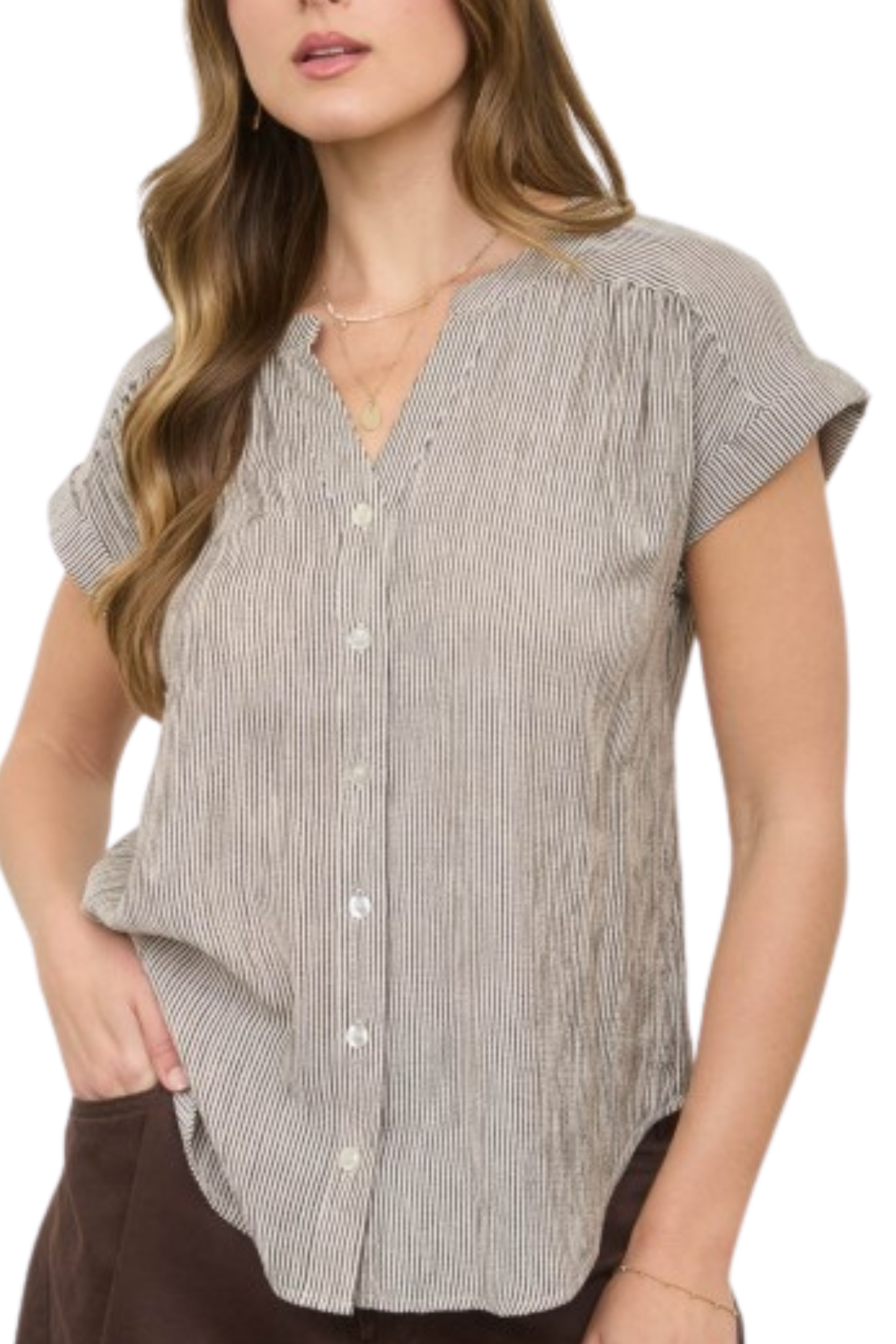 This striped blouse is casual yet cool! It features a v-neckline, cuffed short sleeves, and buttons down the front. Toss it on with jeans and sandals for everyday wear or pair it with trousers for the office!