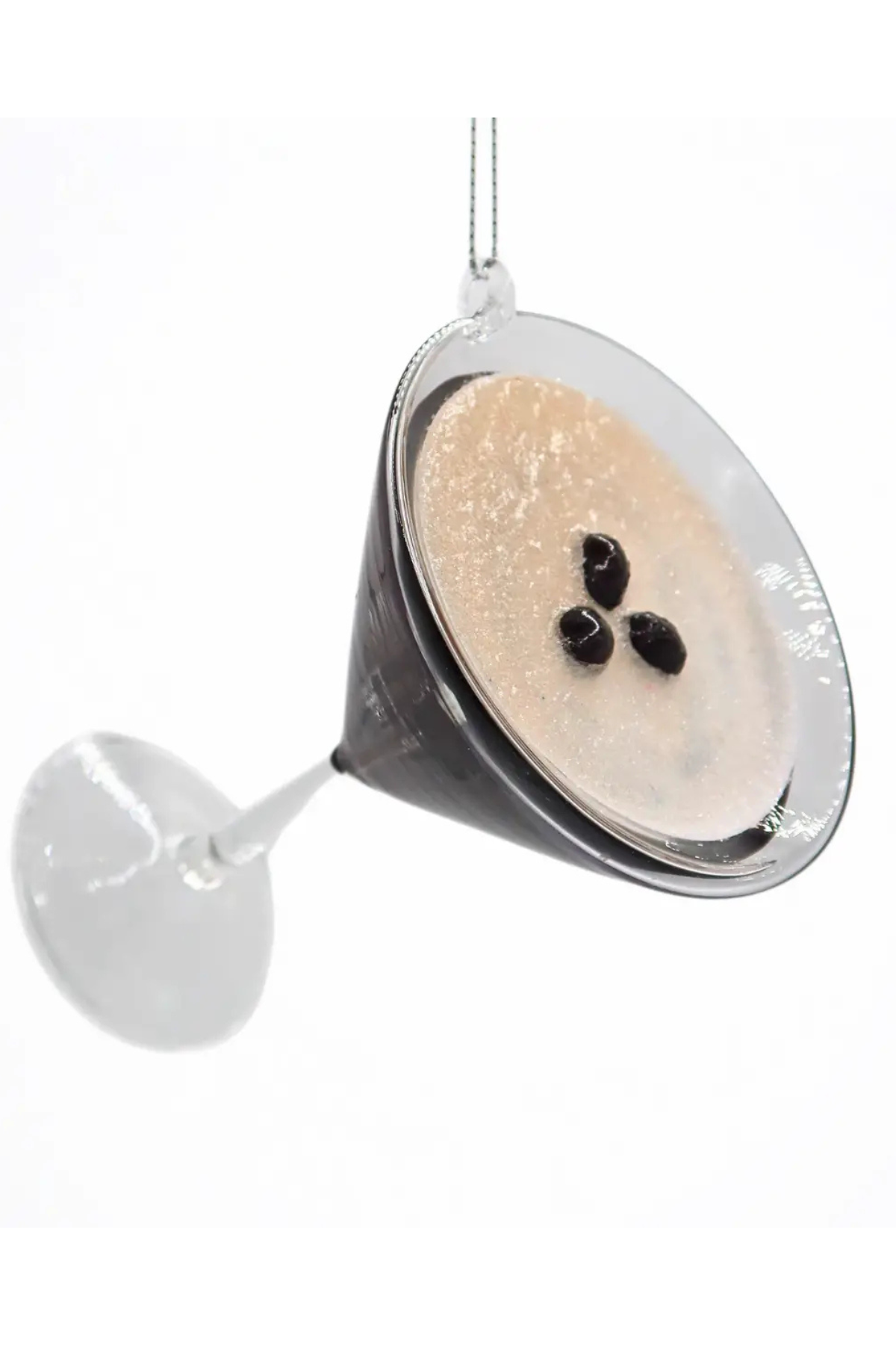 Add some holiday cheer with this playful espresso martini ornament. Made of glass, it features a glittery rim and three tiny espresso beans on top. Perfect for adding a fun, festive touch to your tree—no caffeine required!