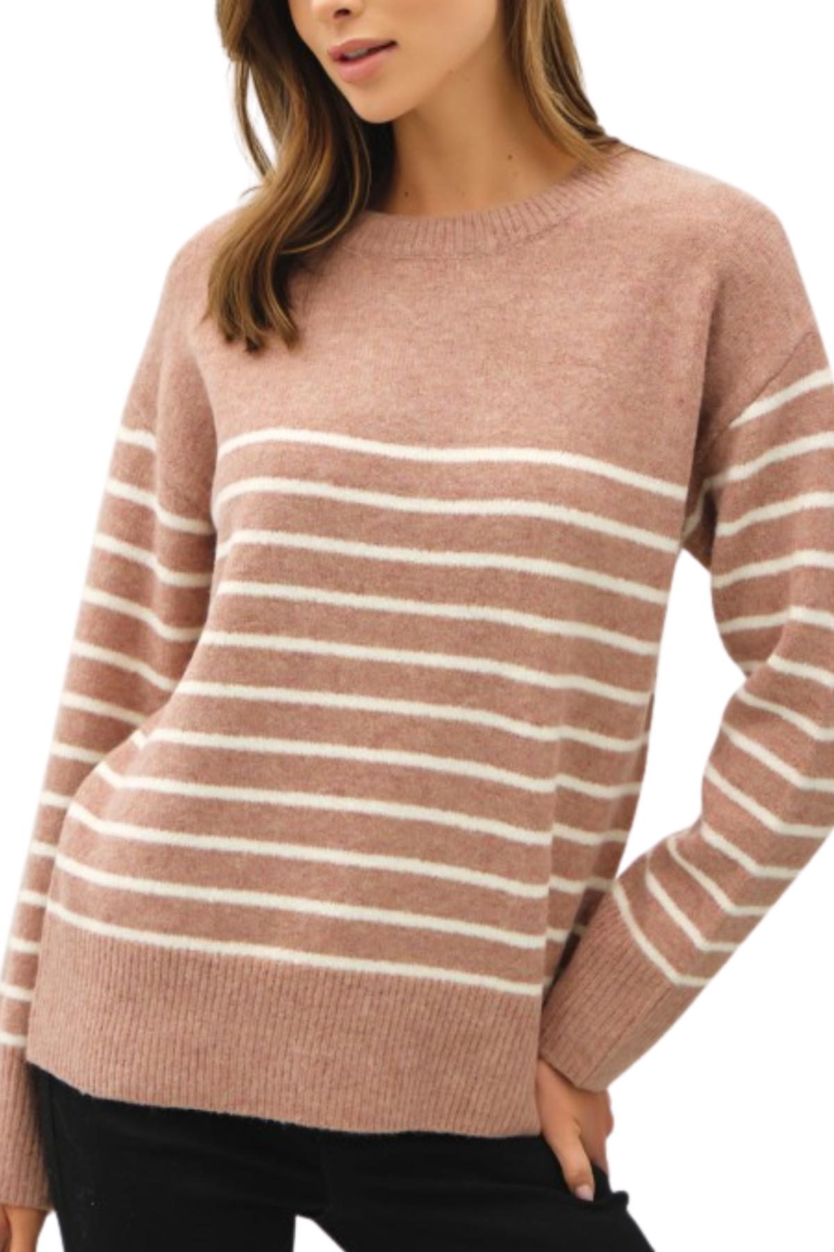 Wrap yourself in cozy charm with the Corina Striped Sweater. This pullover features a fun horizontal stripe design that adds a pop of personality to any outfit. Its boxy fit and long sleeves make it effortlessly comfy, while the classic crew neck and ribbed ends give a polished, playful finish. Perfect for relaxed days where comfort meets style!